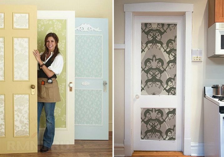 Следващият етап на довършване е декорирането на врати с тапети, плат. В този случай няма специални ограничения, тъй като почти всички изображения и материали с различни текстури могат да бъдат залепени към вратата. На първо място, можете да обърнете внимание на фототапета, който е представен в изобилие в специализирани магазини. Всички хартиени материали, както и стандартните тапети, също могат да бъдат полезни..