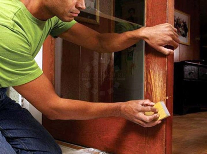 - Първоначално вратата трябва да бъде внимателно подготвена. За това се вземат предвид характеристиките на материала за производство. По принцип дървените изделия подлежат на износване. Ако интериорните врати са покрити с фурнир, се купуват мек восък, както и специален лак и инструмент под формата на шпатула за работа с повърхността на крилото на вратата. За дървени изделия е необходим твърд восък, едра шкурка.