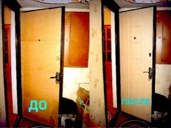 - винаги се извършва предварителна подготовка. Отстранява се старото покритие, отстраняват се лак, боя, следи от ръжда и корозия. Преди да опаковате вратата в нова “обвивка”, трябва да обработите дървото с антибактериални и противогъбични съединения и да грундирате метала с антикорозионен филм;