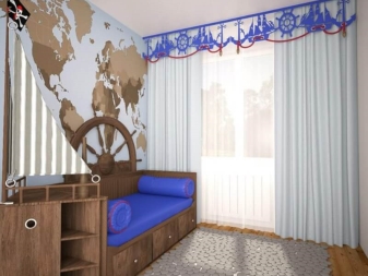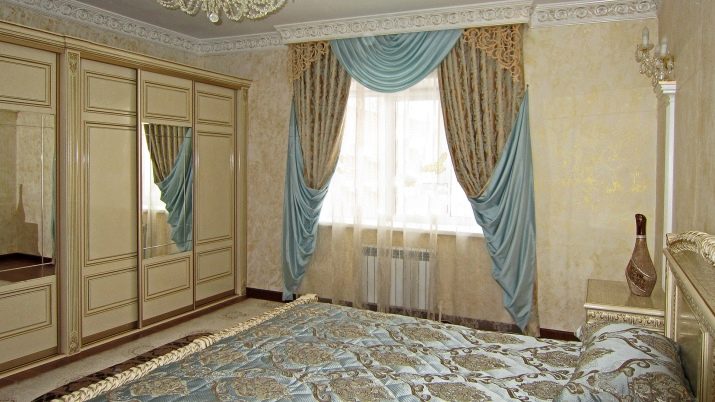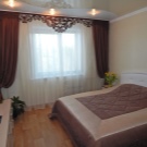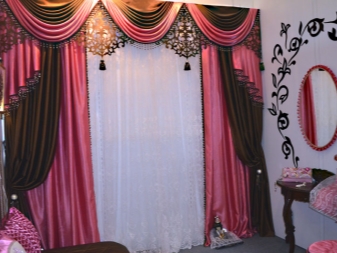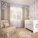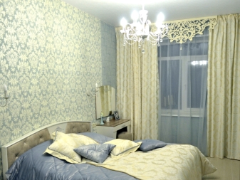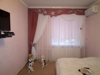 - В тясна стая се препоръчва да инсталирате ламбрекен с ширина на цялата стена. Избирайки светли цветове, можете визуално да разширите пространството на стаята..
