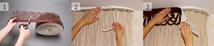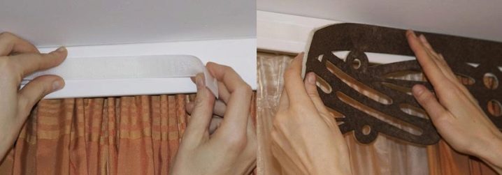 - Освен това по ваша преценка можете залепете подплатата от шевната страна на ламбрекена, вътрешността на бандата обаче изглежда доста добре. След това трябва да работите върху метода на закрепване. Обикновено за тези цели се използва велкро лента. Меката влажна страна е прикрепена към ламбрекена, а лепкавият слой на лентата е залепен с двустранна лента към корниза.