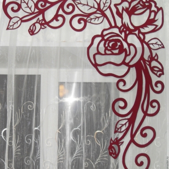 - За украса на ламбрекен често се използват всякакви декоративни елементи.. Наклейката е чудесен начин да разредите цвета и модела. Например цветята, залепени върху дантелен ламбрекен, изглеждат много красиви. Декорациите за шаблони също изглеждат актуални. Можете да вземете интересна бродерия върху завесите, която отеква в бандо.