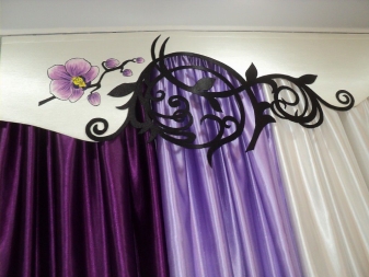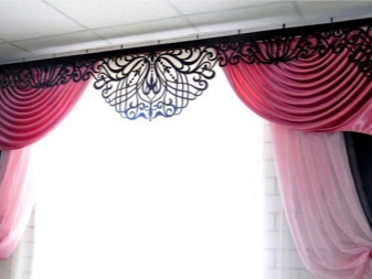 Също така не можете да инсталирате ажурни ламбрекени в банята по същите причини: постоянното излагане на гореща пара ще повреди ламбрекена. В допълнение към самите ламбрекени, можете да поръчате или да направите декоративни елементи, които се припокриват с тях, например куки за завеси.