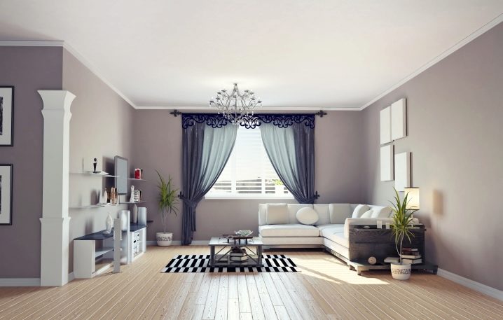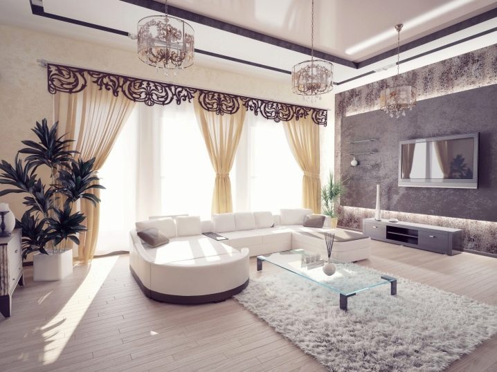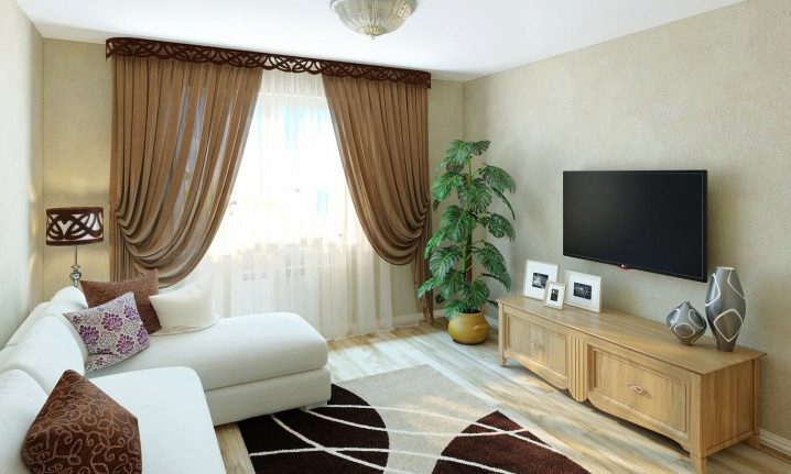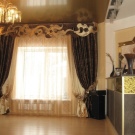 Ето още един хол, панорамният прозорец на който е красиво декориран. Както в предишния пример, цветът на ламбрекена е съчетан с общия цветен фон на интериора..