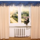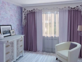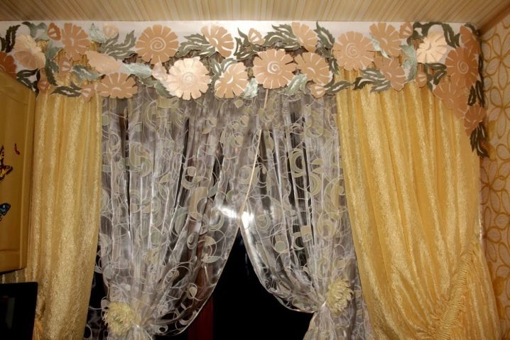 Фигурният ламбрекен, допълнен с термични апликации под формата на цветя, изглежда оживен и сладък. Допълнен с дръжки за завеси, направени в същата стилистична гама, той идеално се вписва в интериора на стаята, маскирайки твърде тесен прозорец и визуално го прави по -широк..