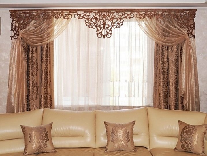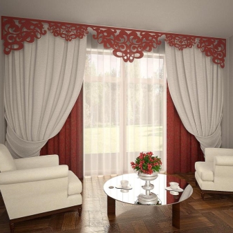 Има два вида банди. Първият се състои от няколко къдрави елемента и се нарича комбиниран. Вторият е модел от една част, изработен индивидуално за измерванията на прозореца. Комбинираният ламбрекен се състои от три вида елементи: централни, странични и ъглови ленти. С малка ширина на прозореца можете да спрете да използвате само централните и ъглови орнаменти, като се откажете от закупуването на странични ленти. В същото време, когато проектирате дълъг корниз, можете да използвате няколко странични ленти..