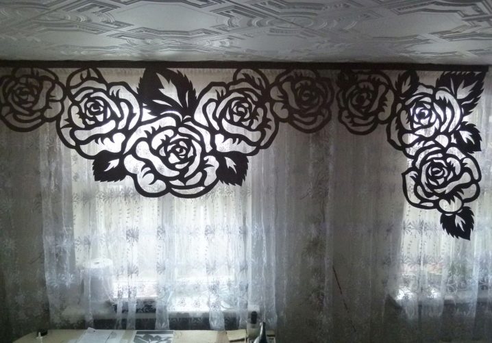 Розите са често срещана тема за ажурни бандо. Този модел се вписва почти във всеки интериор и изглежда много впечатляващ. Снимката показва ъгловите и централните елементи на конструкцията. Поради големия размер на ламбрекена, не беше необходимо да се допълва със странични ленти.