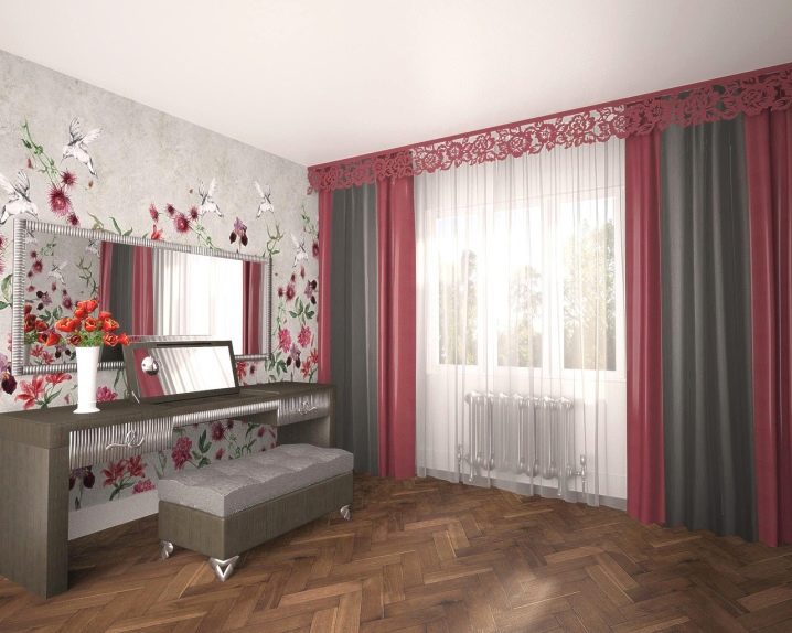 Ето пример за това как къдрава банда може да се комбинира с общия стил на стаята, не само в цвят, но и в орнамент. Флоралната тема се повтаря в модела ламбрекен, който дублира в съдържанието си декорациите на стените. Яркочервеният цвят е компетентно заглушен с тъмно сиво, което го прави да изглежда елегантен и изискан.