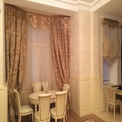 И отново класическият стил. Моля, обърнете внимание, че корнизът не е украсен с комбиниран ламбрекен, а е изработен от плътна лента. Повтарящият се модел изглежда невероятно и не изглежда скучен. Контрастната цветова схема помага визуално да добавите няколко сантиметра височина към стаята..