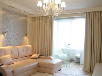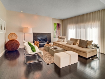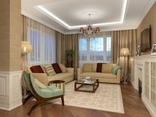 V зала отиваме основно за вечерен релакс, приемане на гости. Тоест залата не е място за постоянно забавление. Ето защо ще бъде подходящо да добавите ярки цветове към интериора на залата. Това ще подобри настроението на присъстващите, ако умело спазвате пропорциите. Малки предмети или малки ярки петна ще създадат усещане за празник. Закачете бежови завеси възможно най -близо до тавана, за да изглежда стаята по -висока.