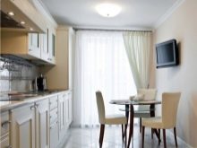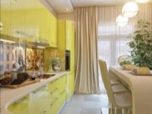 Избор на бежови завеси към кухнята, имате възможност да експериментирате. Използвайки бежови завеси, можете спокойно да изберете кухненски комплект в неутрални цветове и с по -ярка фасада: синьо, свежи зелени или жълти.