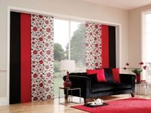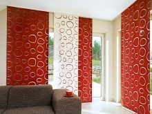 - Японски завеси може да се изпълни и в червено. В този случай завесата може да бъде едноцветна или да има червено -бели орнаменти. И когато се комбинира с панели от други цветове, това ще помогне да се създаде уникален интериор. Такива завеси са подходящи за японски стил, но в други модерни стилове ще бъдат подходящи..