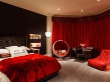 - За много смели хора можете да предложите да виси червени завеси в стаята, където интериорът е направен в черно. Но тук е много трудно да не преминете границата на вулгарността, затова е по -добре да поверите създаването на такъв дизайн на специалист..