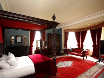 - За спалнята, особено ако е декорирана в класически стил, по -добре е да се даде предпочитание на тежки завеси, които ще затъмнят добре стаята. Но тук можете да закачите и червен тюл. В този случай плътните завеси все още трябва да бъдат, само по -сдържан цвят, например бежов.