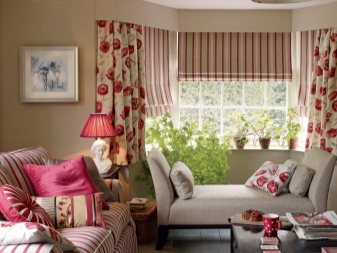 - Червеният флорален орнамент в хола в стил Кънтри в комбинация с римски завеси ще ви помогне да създадете уютна атмосфера в стаята..