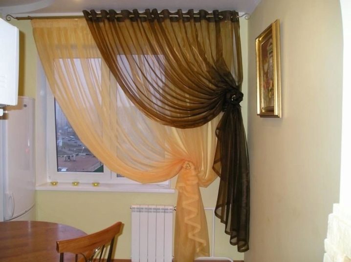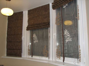 Класическите завеси няма да са на мястото си в кухненското пространство, тук е най -практично да се използват валцувани двойни платна. Тъмна дебела завеса може да бъде съобразена с цвета на кухненските акценти (ярки плочки, мебелни комплекти, текстилен декор), а прозрачният слой може да бъде направен бял или пастелни цветове.