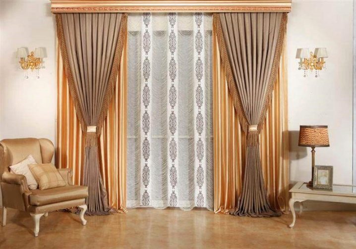 - Комбинацията от злато и бордо е типична за ориенталския интериор. Сините завеси в композиции с двойни завеси се комбинират с тюл в бежови тонове, те ще бъдат хармонични в хола.