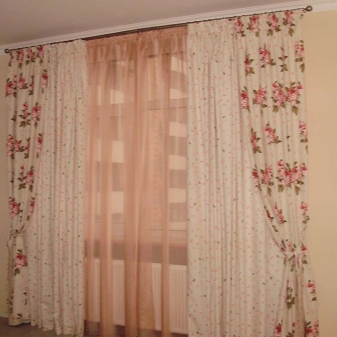 - Двойната завеса изглежда много интересна и необичайна, ако фиксирате едноцветна половина и плат с отпечатък до нея. Този дизайн ще бъде подходящ в стила на Прованс..