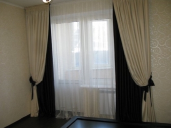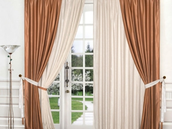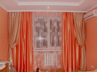 Често в такава стая се окачват двойни завеси с ламбрекени на капсите. Производителите на готови завеси предпочитат памук, лен, брокат, коприна.