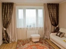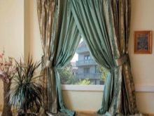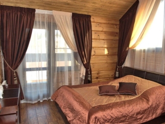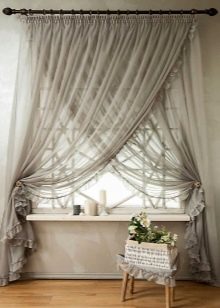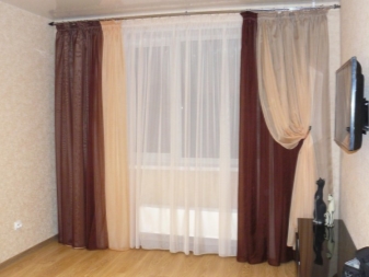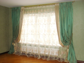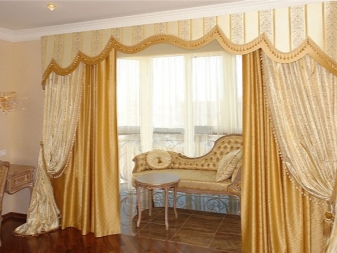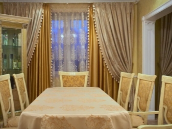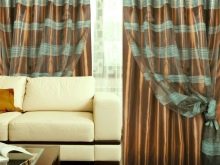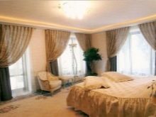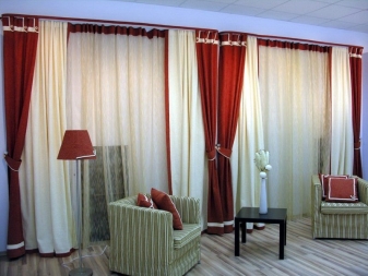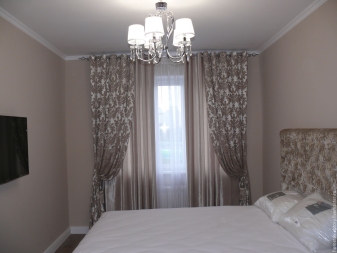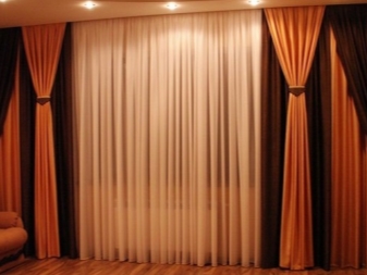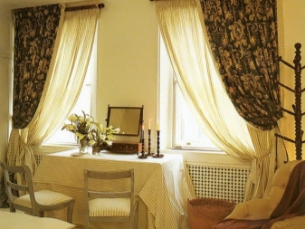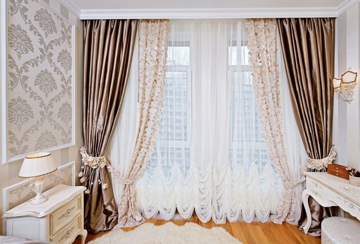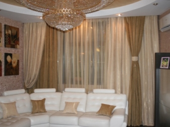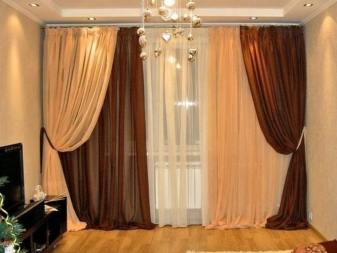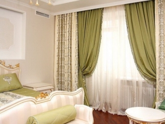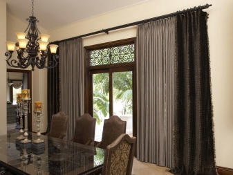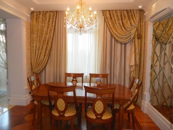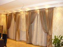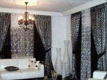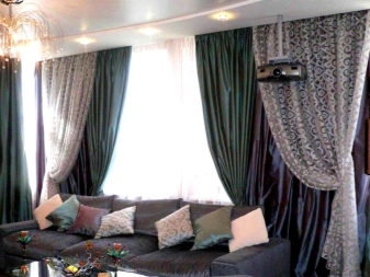 Често в такава стая се окачват двойни завеси с ламбрекени на капсите. Производителите на готови завеси предпочитат памук, лен, брокат, коприна.