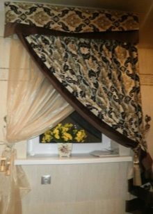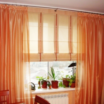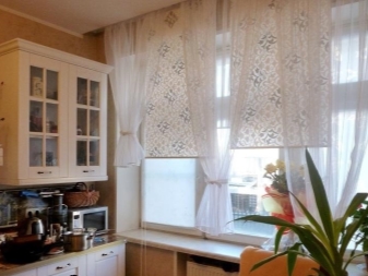Класическите завеси няма да са на мястото си в кухненското пространство, тук е най -практично да се използват валцувани двойни платна. Тъмна дебела завеса може да бъде съобразена с цвета на кухненските акценти (ярки плочки, мебелни комплекти, текстилен декор), а прозрачният слой може да бъде направен бял или пастелни цветове.