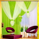 - Хармония на цветовете и акцентите. Завесите трябва да се комбинират хармонично с други елементи на интериора: мебели, стени и т. Н. В същото време те могат да се превърнат в ярък акцент, който ще привлече погледите на домакините и гостите.