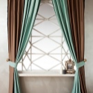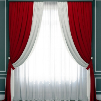 - Комбинация от завеси със същата или подобна цветова схема с различна степен на интензивност. Изглежда страхотно, когато горната част на двуцветния продукт е поставена върху капси, а долната част на куки или щипки. Добра комбинация се получава от следните нюанси: кафе и богат шоколад, прасковено и червено, изумрудено и синьо.