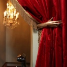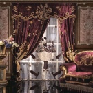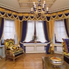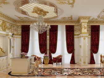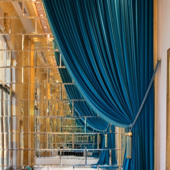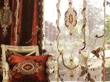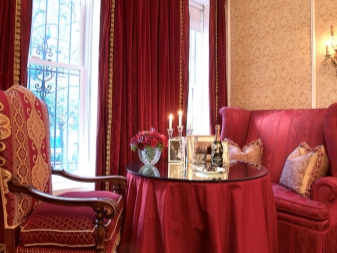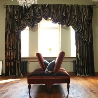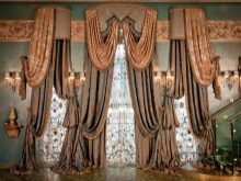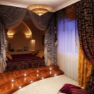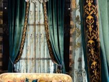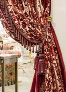 Дизайнерите обикновено избират ярко и преливащо се кадифе за такива помещения, понякога с блясък. Без пастелни нюанси, само ярки цветове – червено, зелено, тъмно синьо, златно, бордо. Завесите трябва да са тежки и добре драпирани. Гънките са заоблени, трябва да има грайфери. Тук са подходящи четки, подрязващи ръба на завесите с плитка с малки помпони. Може да се добавят усукани кабели.