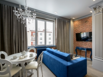 Ако стената е направена от червена тухла, тогава тъмните бордо или тъмносивите завеси са идеални. За бяла тухлена стена завесите от кадифени тъкани от светло сив или бежов цвят ще бъдат добри спътници.