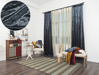 Сред недостатъците на този материал като завеса може да се отбележи сложността на грижите (най -добре е да се вземат такива продукти за химическо чистене), тенденцията за натрупване на прах и тежест – кадифените завеси ще изискват много издръжлива метална завеса.