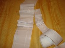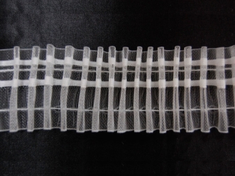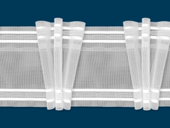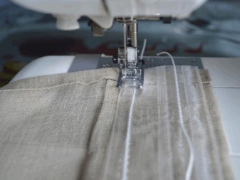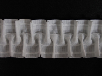 Най -удобното при него е, че е направено не от опъната тъкан, а от плътен материал, поради което е лесно да се пришие на пишеща машина към тъканта, а гънките могат да бъдат направени с всякаква плътност. Можете да регулирате техния размер и количество с няколко връзки, преминали през цялата дължина на лентата..