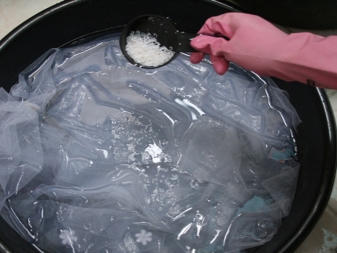 Тюлът се накисва в разтвор на прах за пране с готварска сол (за предпочитане през нощта). Накисващият разтвор се приготвя, както следва: вземете половин чаша прах (който обикновено използвате) върху кофа с вода и добавете сол (без йод) – не повече от 3 супени лъжици са достатъчни. лъжици. Ако има недостиг на време, накисването може да бъде ограничено до 3 часа. В края на фазата на накисване тъканта трябва да се изпере и след това да се изплакне няколко пъти..