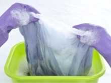 В този случай можете да действате по два начина: изсипете приготвения от синьото разтвор в отделението на пералната машина и изплакнете тюла в него или веднага го измийте с прах, съдържащ зърна от синьо.