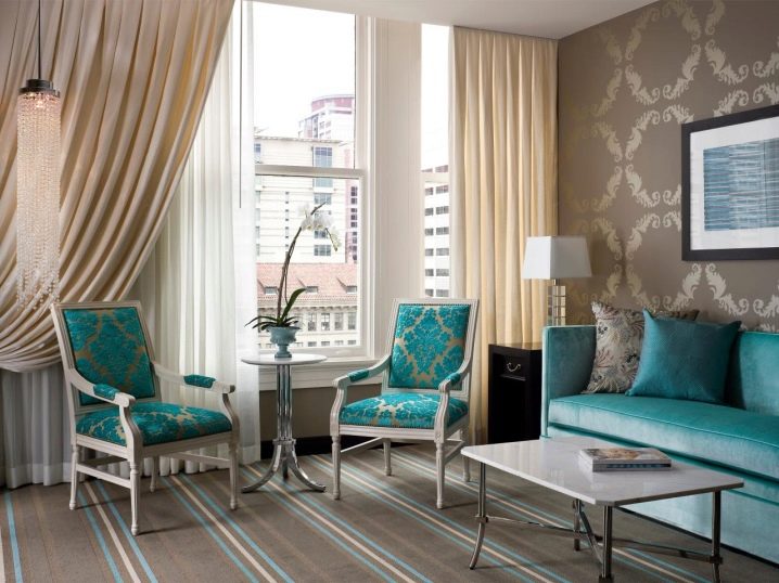Тъмно бежовият тапет е успешно украсен с деликатна кремообразна материя. Печат на мебели и килими в тюркоазени цветове – перфектно съчетани акценти.
