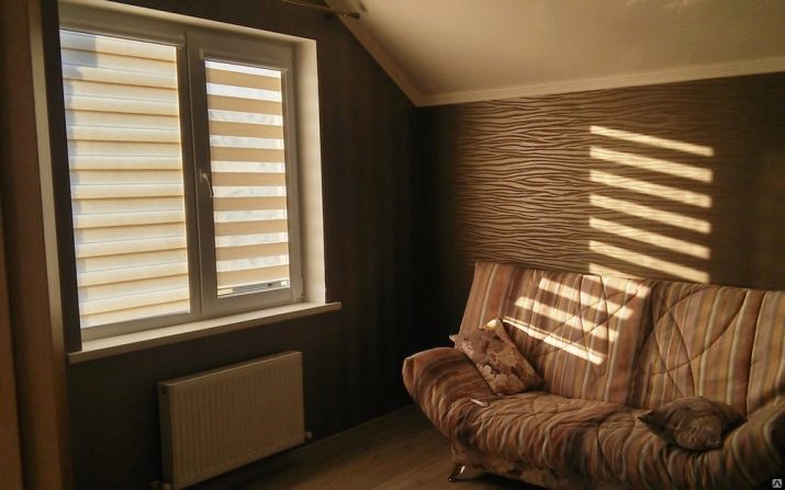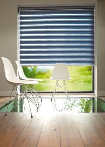 - „Ден -нощ“ или „зебра“ – най -интересният изглед до момента. Това е двойно платно с хоризонтални редуващи се цветни и прозрачни ивици (а цветните са направени малко по -широки). Като завъртите завесата, можете или напълно да направите платното непрозрачно (режим “нощ”), или да оставите необходимите прорези за преминаване на светлината (“ден”).