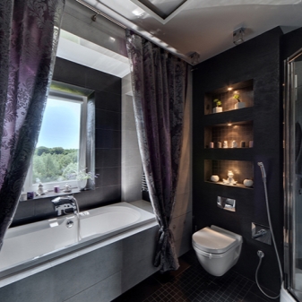 Не всяка баня има прозорец, но всички имат вана. Лилава завеса за нея ще се превърне в цветна украса в стаята. Този цвят ще преобрази стаята.. Дизайнерите съветват да изберете завеси за стаята в лавандулови или люляково-розови нюанси.. Уверете се, че завесата отговаря на цялостната цветова схема на банята.