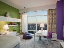 Ансамбълът от зелено и лилаво рядко се използва при проектирането на жилищни помещения, въпреки факта, че такъв дует изглежда колоритен и ярък. Най -популярните и полезни комбинации са мента и люляк, патладжан и билки. Комбинация от къпинови и светлозелени тонове е подходяща за детска стая. Такива бои ще се развеселят всеки ден..