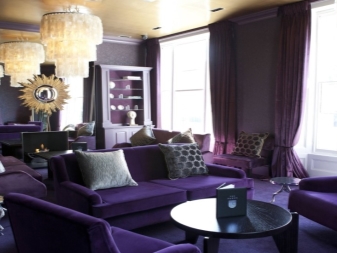 Завесите и завесите в лилави тонове изглеждат луксозно и стилно в зали и дневни, особено ако са декорирани в класически стил. Плътните материи изглеждат особено шикозни в тъмни цветове.. Трябва да се отбележи, че плътните и дълбоки цветове се използват за създаване на изящни декори..