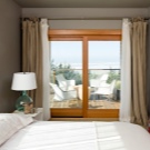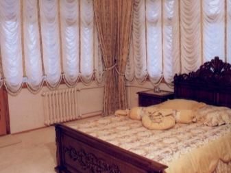 - Първо, обърнете внимание на формата и размера на прозореца.. Често в къщите има нестандартни прозорци, които изискват специален дизайн. Например, напоследък панорамните прозорци, монтирани в спалнята, придобиха особена популярност. В този случай е много трудно да се намери приличен дизайн, но изборът на класически прави завеси без ламбрекени е отличен вариант..