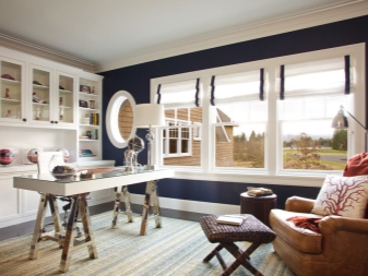 - За офис помещения трябва да изберете тъмни завеси с тъпи монохромни цветове, за да не отвличате вниманието от задачите и важните въпроси, но в същото време да създавате необходимата работна атмосфера.