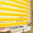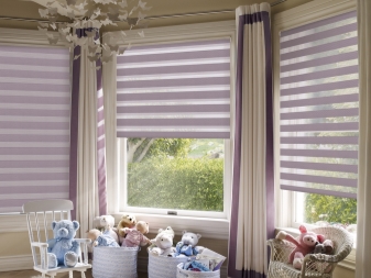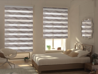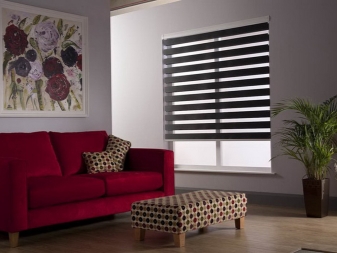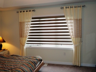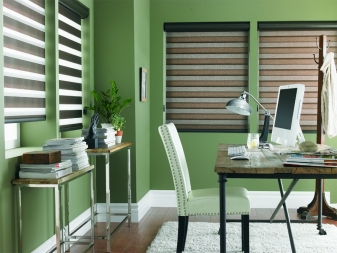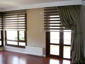 - За тези, които все още не искат да изоставят обичайните завеси или тюл, можете да предложите отлично решение: комбинирайте ролетни щори и обикновени завеси на прозореца, като се уверите, че материалите са в хармония помежду си както по качество, така и по цвят. Ако “зебрата” е допълнена с красиви пердета от плат до пода, такъв ансамбъл за прозорци перфектно ще се впише в интериора на всяка стая..