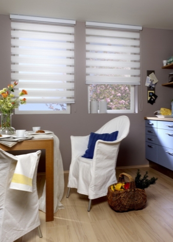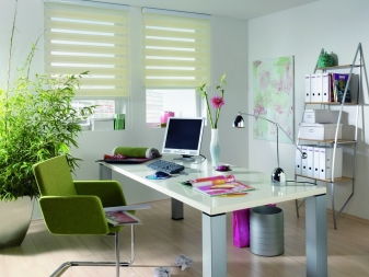 - Ако стаята е малка, по -добре е да го украсите със завеси от светли цветове и техните нюанси. Кремавите и меки зелени ролетни нюанси ще изглеждат страхотно в кухнята и спалнята, както и във всяко средно голямо офис пространство. Ако желаете, можете да изберете завеси с всякакъв флорален модел за кухнята – отличен заместител на обикновените завеси. Сред моделите с такива шарки често има дори такива, които на пръв поглед трудно се различават от светлите завеси за прозорци, особено ако десенът е направен на бледо бял или кремав фон. В същото време рисунката перфектно скрива вече не особено забележимата текстура на ивиците..