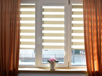 Ако ролковите завеси са едноцветни, можете да изберете прозрачен тюлов комплект със същия или подобен цвят за тях, ако са двуцветни, тогава можете да вземете завеси както с монохроматичен план, така и с онези цветове, които преобладават в завесите.