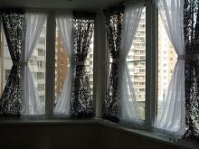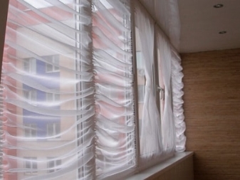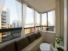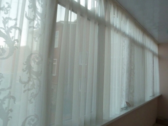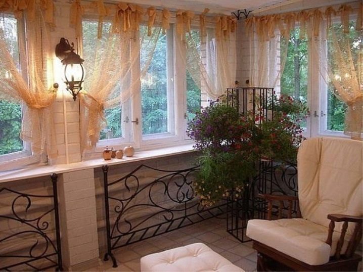 Остъкленият балкон е уютно място за почивка през топлия сезон. Заслужава да се отбележи, че прозорците без завеси в хола изглеждат празни и понякога груби. В този случай е необходимо да се подредят отворите. Деликатният и безтегловник тюл е идеален за декориране на прозорци, особено ако жителите на къщата не искат да заемат вече компактното пространство на балкона с текстилни материали.