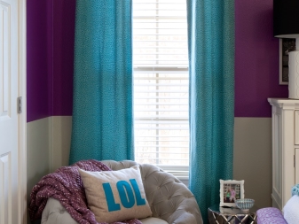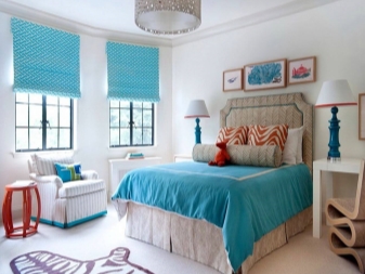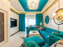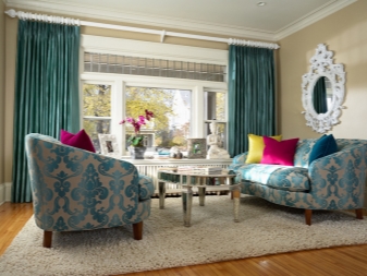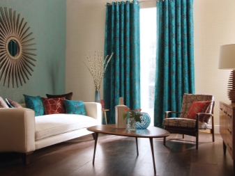 Когато избирате завеси, дайте предпочитание на класическата, проста и права кройка. Подчертайте красотата на живи тюркоазени завеси с подходящ диван или възглавници. Добавете ярък килим, вази, фоторамки. Спазвайте умереността, в противен случай ще бъде трудно да бъдете в твърде цветна стая. Опитайте се да избягвате яркочервени нюанси, тази комбинация изглежда твърде предизвикателна.