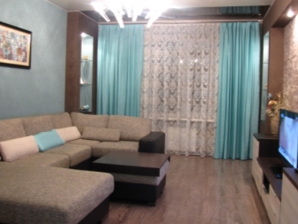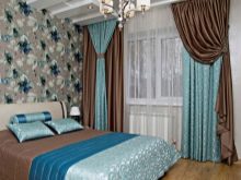 Използвайте тюркоазени завеси с плат с различен цвят. Както вече споменахме, той може да бъде кафяв, бежов, бял и други цветове. Използвайте наслояване.