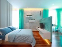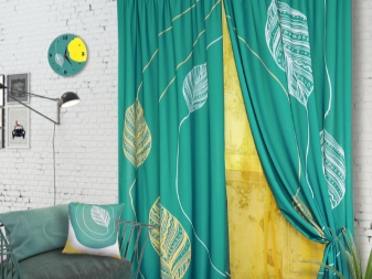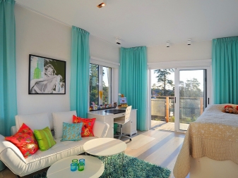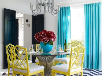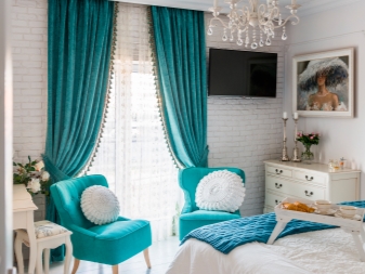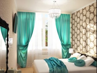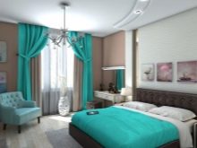 Един от най -популярните варианти е поставянето на тюркоазени завеси върху капсите. Това се дължи на лекотата на използване, лесна поддръжка и стилен външен вид. Разположени от тавана до дъното, тюркоазените завеси се превръщат в ярък, привлекателен център на стаята. Те сякаш разтягат пространството и го разширяват..