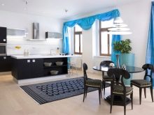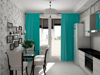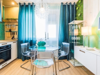 Цветът на тюркоаз изглежда много интересен и стилен в кухнята. Това могат да бъдат дълги затъмняващи завеси до пода или обратно, леки завеси от безтегловност. За кухнята ярки наситени нюанси на тюркоаз са идеални. Можете да експериментирате и да опитате да комбинирате тюркоаз с еднакво жив цвят като жълто или ярко зелено..