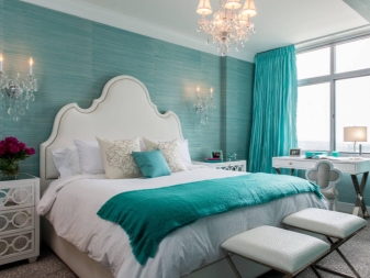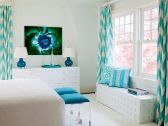 - Тюркоазено + бяло. Много свежа, лека, повдигаща комбинация. Стаята ви ще бъде изпълнена с прохлада и морска свежест. Ярка контрастна комбинация от снежнобяло бяло с тюркоаз е идеална за почти всяка стая. Когато избирате, спрете на преобладаващото количество бели и много малко тюркоазени елементи. В този случай ще са достатъчни ярки завеси и няколко възглавници или покривки..