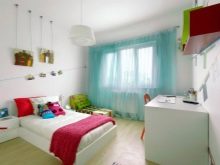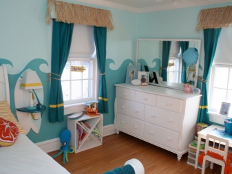 За момче нека бъде комбинация от синьо и тюркоазено. Създайте морска стая. За да направите това, изберете комбинация от бяло, тъмно синьо и тюркоазено. За завеси можете да вземете малки декоративни елементи под формата на котви, волани или морски звезди.